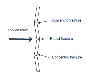 Most of the glass is projected forward, in the direction of the blow. But some of the fragments will be projected backwards, towards the person breaking the window, up to a distance of 3 metres known as 'backscatter'. Anyone standing close enough when the window breaks will be covered in tiny fragments of glass which will stick to their clothing and their hair. Reading the signs Most of the glass encountered by forensic scientists originates from windows, headlamps, bottles and containers. All this commercial glass is similar in composition and the usual methods of chemical analysis are of little help in distinguishing between them. The simplest method used to compare pieces of broken glass is to fit them together like a jigsaw, though this is rarely possible due to the small size of samples. However, large fragments of glass that originated from the point of impact do show characteristic 'rib' (or 'heckle') marks along the edges. And these marks can be used to determine the side on which the impact occurred and so help to reconstruct the window.