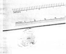 Often it is difficult to determine just from the size and shape of a hole in glass whether it was made by a bullet or by some other projectile. For instance, a small stone thrown at a comparatively high speed against a pane of glass will often produce a hole very similar to that produced by a bullet. On the other hand, a large stone can completely shatter a pane of glass in a manner closely resembling the result of a close-range shot. However, in the latter instance, the presence of gunpowder deposits on the shattered glass fragments does point to damage caused by a firearm. When it penetrates glass, a high-velocity projectile such as a bullet often leaves a round, crater-shaped hole that is surrounded by a nearly symmetrical pattern of radial and concentric cracks. The hole is inevitably wider at the exit side (see Figure 4-17), and hence its examination is an important factor in determining the direction of impact. However, as the velocity of the penetrating projectile decreases, the irregularity of the shape of the hole and of its surrounding cracks increases, so that at some point the hole shape will provide no assistance for determining the direction of impact. At this time, information derived from an examination of the radial and concentric fracture lines may prove a useful alternative for determining the direction of impact. When a force pushes on one side of a pane of glass, the elasticity of the glass permits it to bend in the direction of the force applied. Once the elastic limit is exceeded, the glass begins to crack. As shown in Figure 4-18, the first fractures form on the surface opposite that of the penetrating force, and these fractures develop into radial lines. The continued motion of the force places tension on the front surface of the glass, resulting in the' formation of concentric cracks. An examination of the edges of the radial and concentric cracks frequently reveals stress markings whose shape can be related to the side on which the window first cracked. Stress marks, shown in Figure 4-19, are shaped like arches that are perpendicular to one glass surface and curved nearly parallel to the opposite surface. The importance of stress marks stems from the observation _ that the perpendicular edge always faces the surface on which the crack originated. Thus, in examining the stress marks on the edge of a radial _ crack near the point of impact, the perpendicular end is always found to be located opposite the side from which the force of impact was applied. For a concentric fracture, the perpendicular end always faces the surface on which the force originated. A convenient way for remembering these observations is the 3R Rule-Radial cracks form a Right angle on the Reverse side of the force. These facts will enable the examiner to deter mine readily the side on which a window was broken. Unfortunately, the absence of radial or concentric fracture lines prevents the above observations from being applied to broken tempered glass