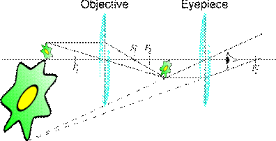 In most microscopes, the eyepiece is a compound lens, which is made of two lenses one near the front and one near the back of the eyepiece tube forming an air separated couplet. In many designs, the virtual image comes to a focus between the two lenses of the eyepiece, the first lens bringing the real image to a focus and the second lens enabling the eye to focus on the now virtual image. In all microscopes the image is viewed with the eyes focused at infinity (mind that the position of the eye in the above figure is determined by the eye's focus). Headaches and tired eyes after using a microscope are usually signs that the eye is being forced to focus at a close distance rather than at infinity.