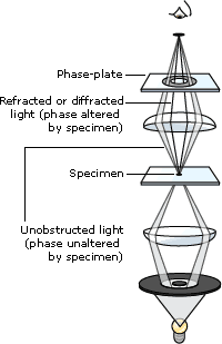 The Phase Contrast Microscope: The phase contrast microscope is widely used for examining such specimens as biological tissues. It is a type of light microscopy that enhances contrasts of transparent and colorless objects by influencing the optical path of light. The phase contrast microscope is able to show components in a cell or bacteria, which would be very difficult to see in an ordinary light microscope. Phase contrast is preferable to bright field microscopy when high magnifications (400x, 1000x) are needed and the specimen is colorless or the details so fine that color does not show up well.