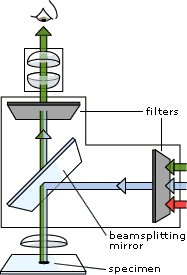 The basic task of the fluorescence microscope is to let excitation light radiate the specimen and then sort out the much weaker emitted light from the image. First, the microscope has a filter that only lets through radiation with the specific wavelength that matches your fluorescing material. The radiation collides with the atoms in your specimen and electrons are excited to a higher energy level. When they relax to a lower level, they emit light. To become detectable (visible to the human eye) the fluorescence emitted from the sample is separated from the much brighter excitation light in a second filter. This works because the emitted light is of lower energy and has a longer wavelength than the light that is used for illumination.