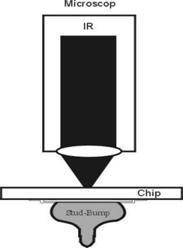 Principle: A IR lamp emits light between 800 and 2000 nm. The beam is focused on the bottom side of the semiconductor and the reflected signal is detected by an IR camera. In order to apply this method the back side of the electrical device has to be polished, otherwise the IR light would be scattered. Strengths: 1) Relatively cheap 2) Partially quantitative (strain fields) 3) Large and small areas can be investigated at medium resolution (ca. 1 µm). Weaknesses: 1) Well polished surfaces on both sides required 2) Involved specimen preparation if decoration is used 3) Often not very specific as to the nature of defects 4) Only applicable to "medium" defect densities 5) Not overly sensitive 6) Interpretation uncertain if decoration techniques are used.