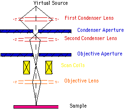 Scanning Process: In a typical SEM, electrons are thermionically emitted from a tungsten or lanthanum hexaboride (LaB6) cathode and are accelerated towards an anode; alternatively, electrons can be emitted via field emission (FE). Tungsten is used because it has the highest melting point and lowest vapour pressure of all metals, thereby allowing it to be heated for electron emission. The electron beam, which typically has an energy ranging from a few hundred eV to 100 keV, is focused by one or two condenser lenses into a beam with a very fine focal spot sized 0.4 nm to 5 nm. The beam passes through pairs of scanning coils or pairs of deflector plates in the electron optical column, typically in the objective lens, which deflect the beam horizontally and vertically so that it scans in a raster fashion over a rectangular area of the sample surface. When the primary electron beam interacts with the sample, the electrons lose energy by repeated scattering and absorption within a teardrop-shaped volume of the specimen known as the interaction volume, which extends from less than 100 nm to around 5 µm into the surface. The size of the interaction volume depends on the electrons' landing energy, the atomic number of the specimen and the specimen's density. The energy exchange between the electron beam and the sample results in the emission of electrons and electromagnetic radiation, which can be detected to produce an image