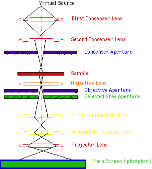Working: TEMs work by using a tungsten filament to produce an electron beam in a vacuum chamber. The emitted electrons are accelerated through an electromagnetic field that also narrowly focuses the beam. The beam is then passed through the sample material. The specially prepared sample is a very thin (less than 100nm) slice of material. The electrons that pass through the sample hit a phosphor screen, CCD or film and produce an image. Where the sample has less density, more electrons get through and the image is brighter. A darker image is produced in areas where the sample is more dense and therefore less electrons pass through.